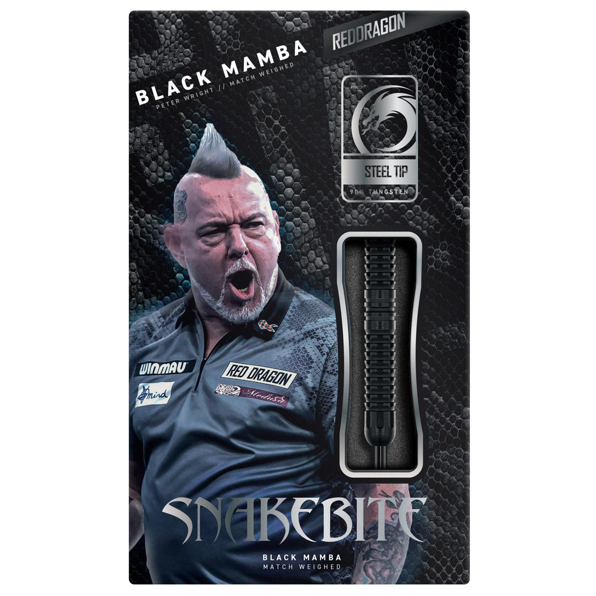 Visually, the Black Mamba lives up to its name, a classic blacked-out barrel with a sleek, tour-inspire profile. Each dart is matched with signature Snakebite-designed flights, completing a bold, professional look that captures Peter Wright’s unique style and energy.
