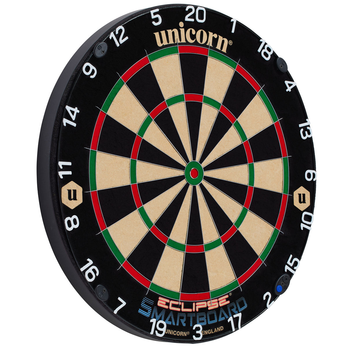 The Unicorn Eclipse® Smartboard blends cutting-edge technology with traditional dartboard craftsmanship to deliver the ultimate playing experience for all darts enthusiasts. Its enhanced playing surface features classic red, green and black tones, crafted from premium Grade A sisal for improved surface recovery and superior dart retention, ensuring minimal bounce-outs and consistent performance. The embedded Eclipse® radial spider and ultra-slim steel-plated wiring expand double and treble scoring zones while reducing deflections for competitive play. Sync your scores with the updated Unicorn Scorebuddy® app, where Party Mode lets you compete with your friends in dynamic, interactive games for endless fun.